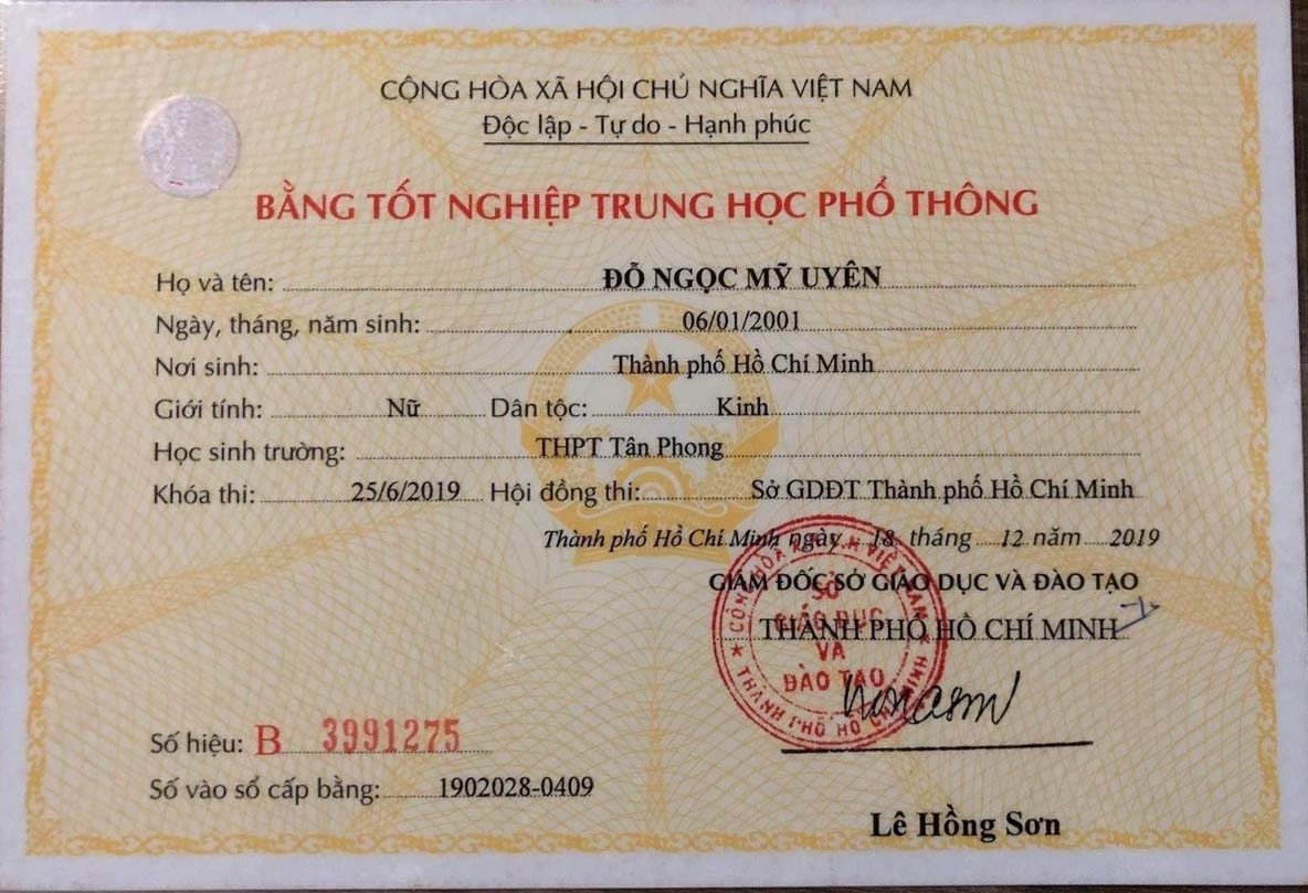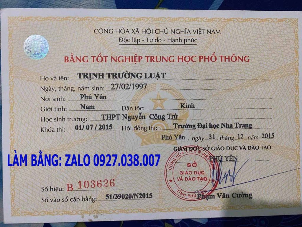 Bằng THPT – Bằng Cấp 3 Phú Yên được làm từ phôi thật, tem thật của các trường. Do vậy, chúng tôi đảm bảo chất lượng như bằng thật chất lượng chính xác 100%. Bao soi, bao công chứng trên toàn quốc